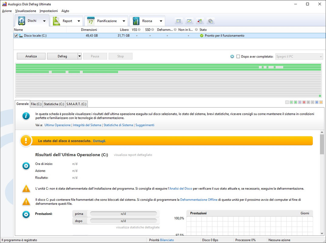 Auslogics Disk Defrag è semplice da utilizzare e si presenta con un'interfaccia estremamente intuitiva. L'utente può avviare la fase di analisi del disco per verificare lo stato della memorizzazione dei file, successivamente il software fornirà informazioni sulla necessità di eseguire l'operazione di deframmentazione.